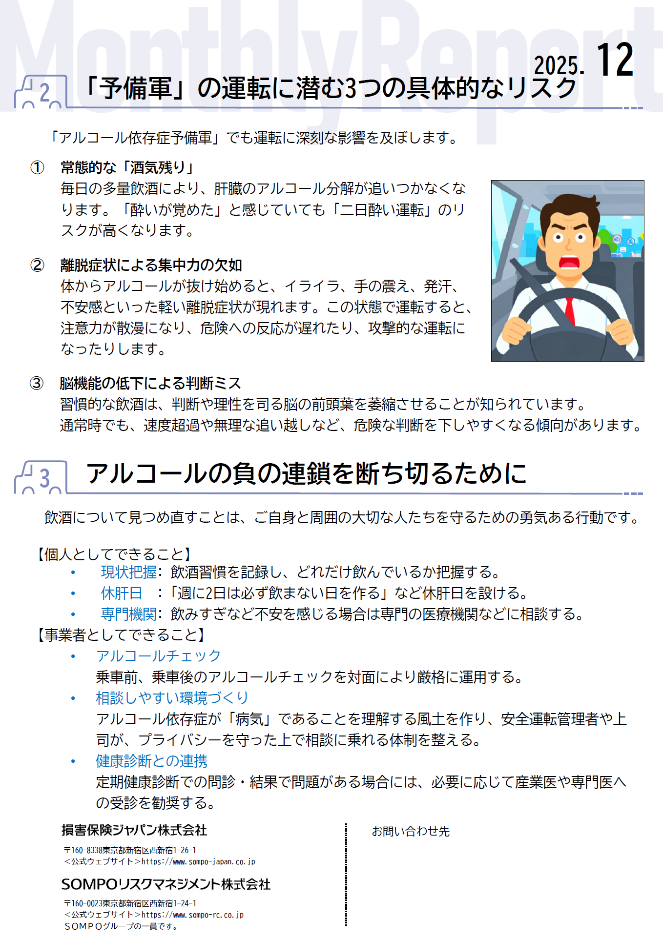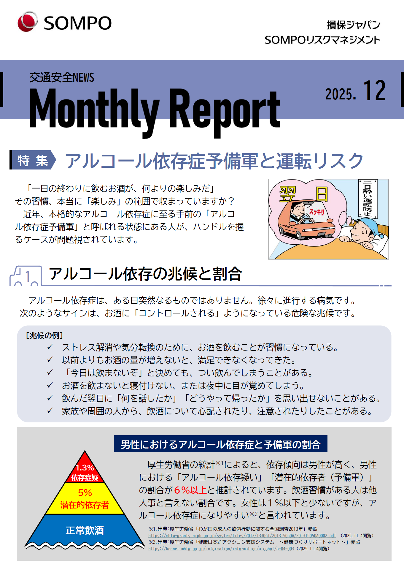 交通安全NEWS マンスリーレポートに、「アルコール依存症予備軍と運転リスク」というテーマが紹介されていました。 レポートを見ると予備軍の段階でも・体にアルコールが抜けきらない「酩酊残り」・離脱症状による集中力の低下・脳機能低下による判断ミスなどが起こりやすく、運転には大きなリスクがあることが分かります。 これから年末に向けて飲み会が増える時期になりますので、安全のためにも、ぜひ一度目を通してみてください。